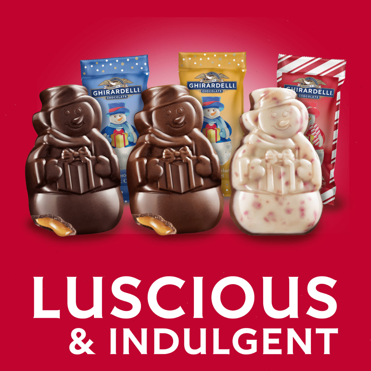 GHIRARDELLI Holiday Chocolate Snowmen Assortment is a chocolate lover's dream. Each individually wrapped chocolate snowman is made with premium ingredients and high quality cocoa beans. The perfect gift for a variety of occasions, these assorted chocolate snowmen are a great way to put smiles on the faces of your colleagues, family and friends. Also ideal for entertaining, these festive chocolate snowmen are delectable post dinner holiday treats, and they add a festive sparkle to candy dishes. Each package contains the following assortment of holiday candy flavors: Dark Chocolate Sea Salt Caramel, Peppermint Bark and Milk Chocolate Caramel. GHIRARDELLI Makes the Holidays A BITE BETTER.