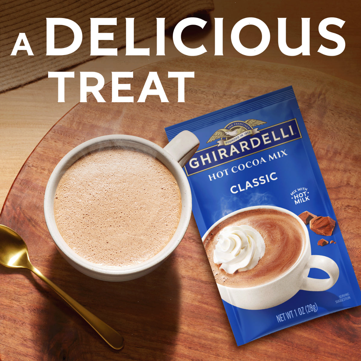 Enjoy GHIRARDELLI Classic Hot Cocoa Mix, a delightful treat for cocoa lovers. This mix offers a smooth, creamy, and balanced chocolatey flavor. Perfect for cozying up with a warm mug any time of the year, it's an ideal way to elevate your daily routine. Use this mix to create indulgent hot cocoa or enhance your favorite desserts. GHIRARDELLI products are crafted with premium ingredients. GHIRARDELLI Makes Life A Bite Better.