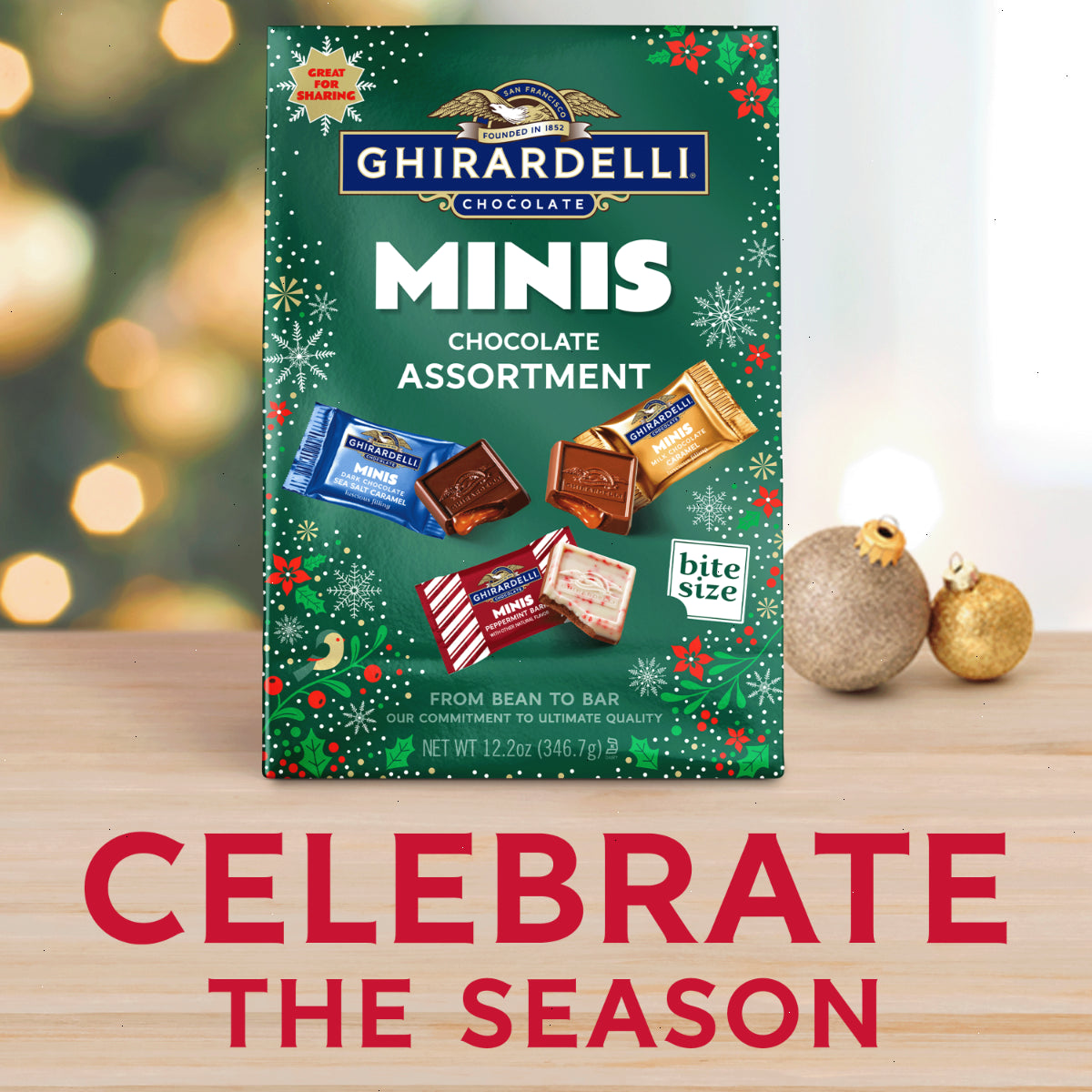 Reward yourself this season with the perfect combination of our signature slow-melting chocolate in a perfect bite size. Enjoy Dark Chocolate Sea Salt Caramel, Peppermint Bark and Milk Chocolate Caramel. Ghirardelli Holiday Minis Chocolate Assortment features intense, slow-melting chocolate in your favorite holiday flavors. Each individually wrapped chocolate mini is made with rich, premium ingredients and high quality cocoa beans. The perfect gift for a variety of occasions, these assorted minis are a great way to put smiles on the faces of your colleagues, family and friends. Also ideal for entertaining, these chocolate minis are delectable post dinner bite-size holiday treats, and they add a festive sparkle to candy dishes. Ghirardelli Makes the Holidays a Bite Better.