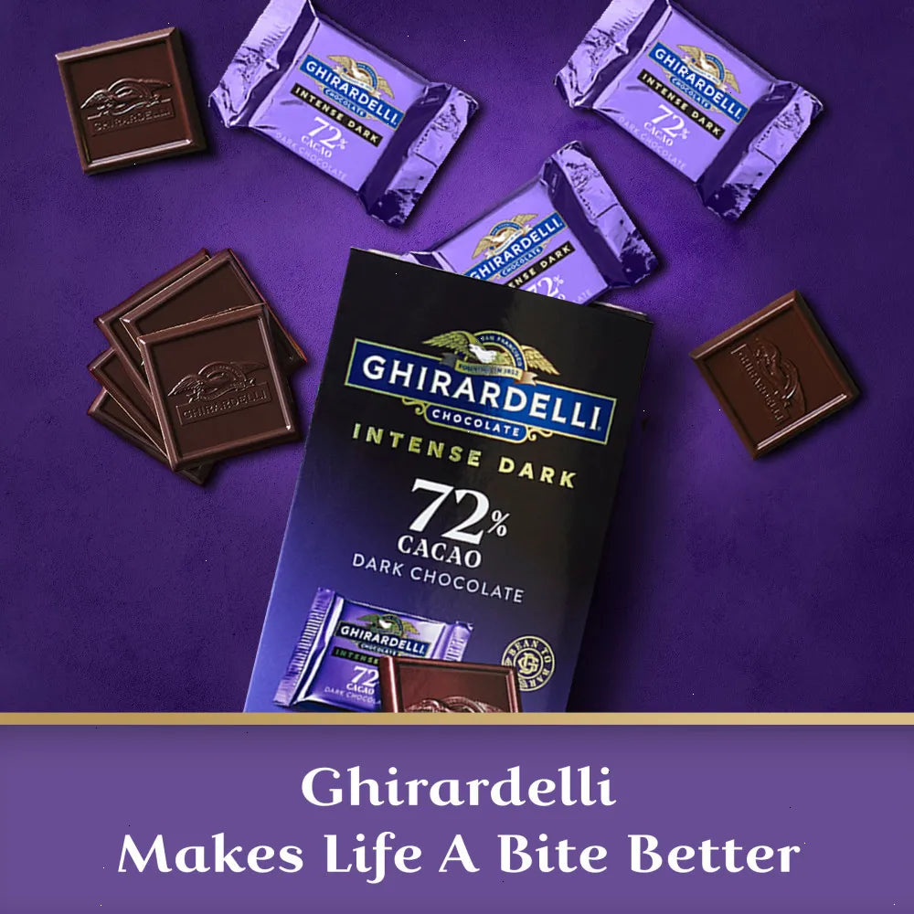 Experience the intense pleasure of Ghiradelli's Intense Dark 72% Cacao Dark Chocolate Squares. Enjoy the subtle flavors of mocha, ripe blackberry and succulent cherry in every bite. Perfect for an after dinner treat, party food, or gift, these individually wrapped chocolate squares come in a case of 6 bags.