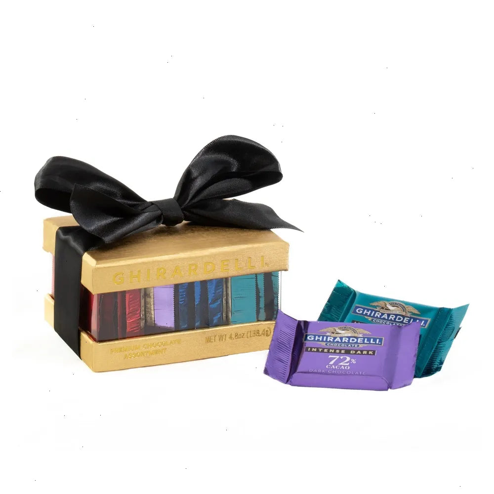 Need a chic housewarming gift, something to celebrate a friend's engagement, or stylish party favor? This adorable assorted chocolate gift box makes any occasion more delicious. Wrapped in a sleek black ribbon, this chocolate gift box is packed with a rich assortment of 12 Intense Dark Premium Chocolate SQUARES.