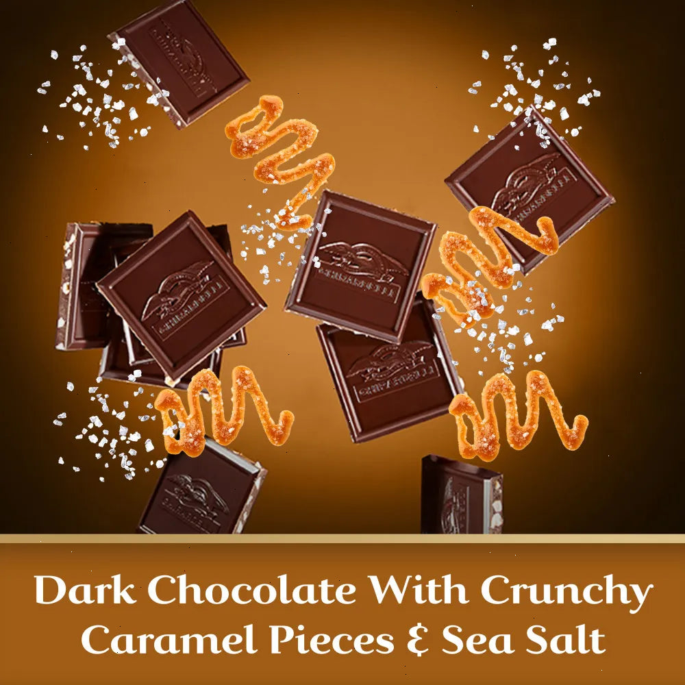 Indulge your senses with a luscious GHIRARDELLI Salted Caramel Intense Dark Chocolate Bar. This dark chocolate bar offers a sweet and salty treat that is sure to satisfy your cravings. Crunchy caramel pieces with a touch of sea salt surround an indulgent blend of intense dark chocolate. Enjoy this perfectly balanced treat or share it as a gift with friends and family. With twelve (12) 3.5 oz bars per case, sharing with friends and family is easy.