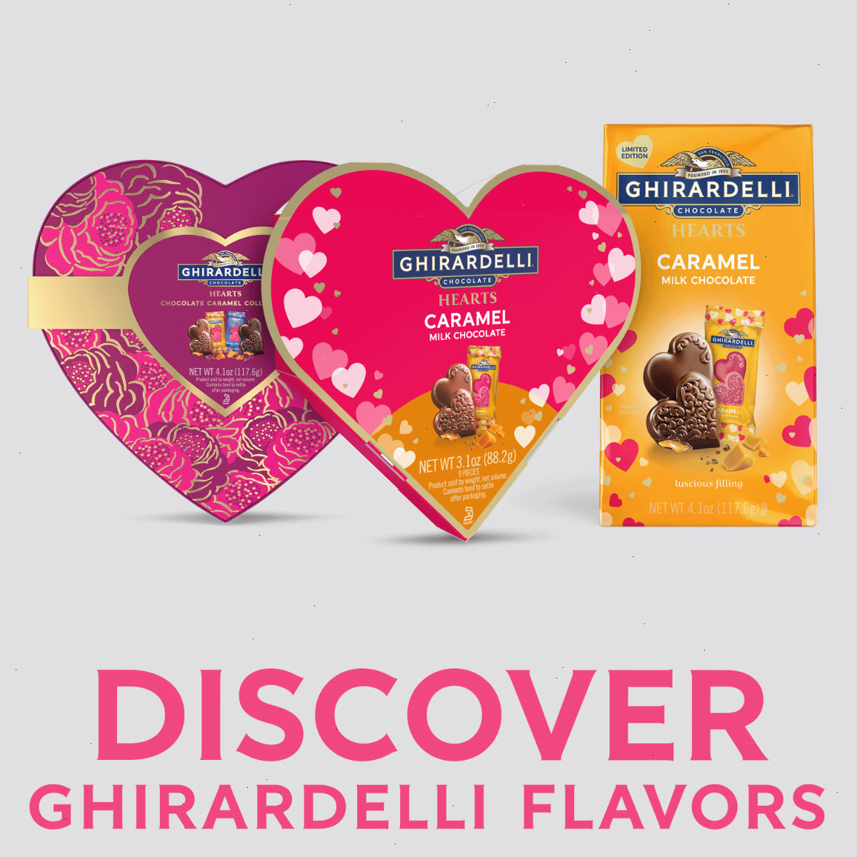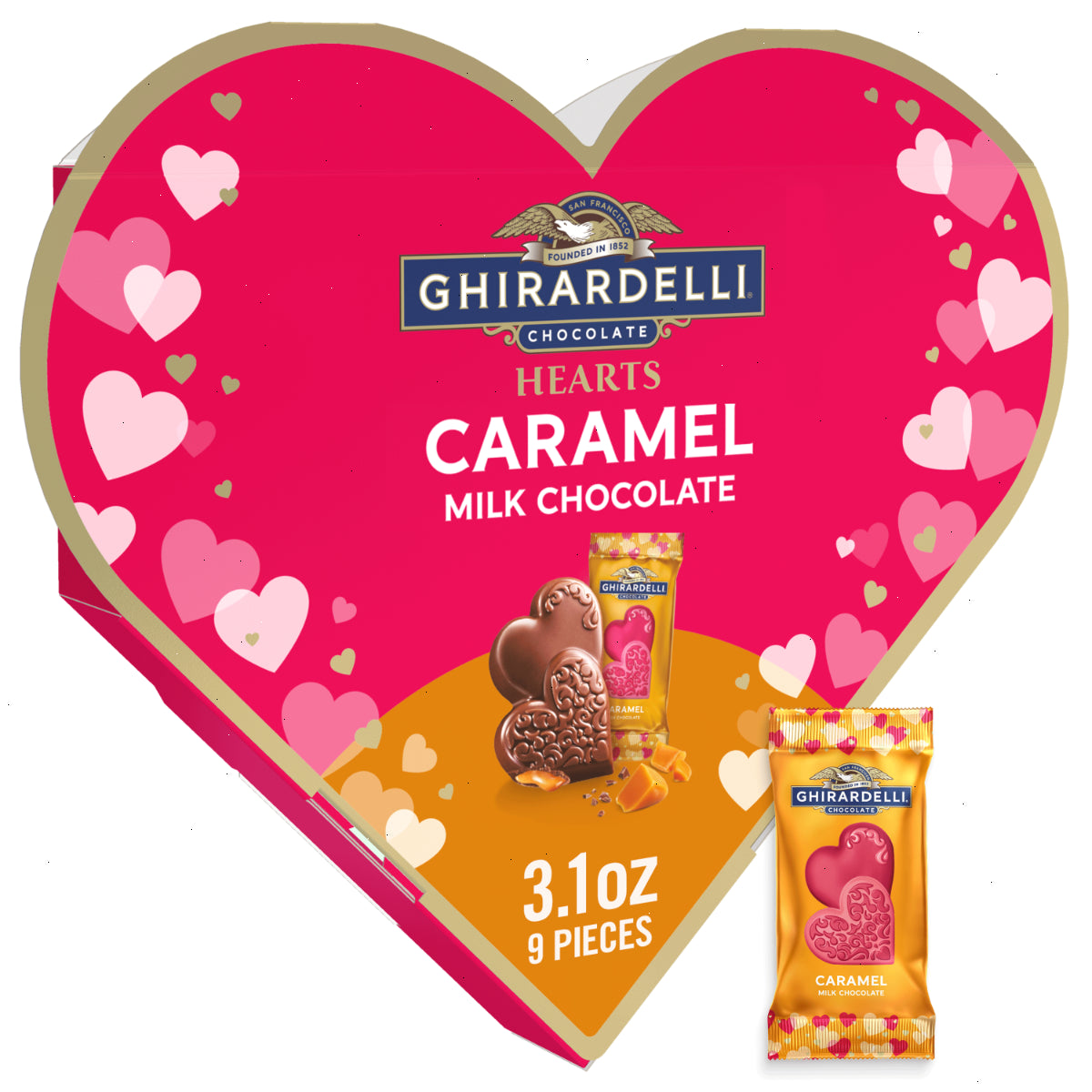 Celebrate the season of love with GHIRARDELLI Caramel Milk Chocolate Hearts. Individually wrapped candy hearts are the perfect gifts for loved ones or that special someone. Each 3.1 ounce heart gift of chocolate caramel candy features sweet milk chocolate with luscious caramel filling for an indulgent Valentine's Day treat. The festive heart-shape candy is the perfect way to celebrate the season of love. These caramel milk chocolate hearts are crafted with premium ingredients, including high quality cocoa beans, for a delicious, rich chocolate treat, and they're certified kosher. GHIRARDELLI Makes Life a Bite Better.