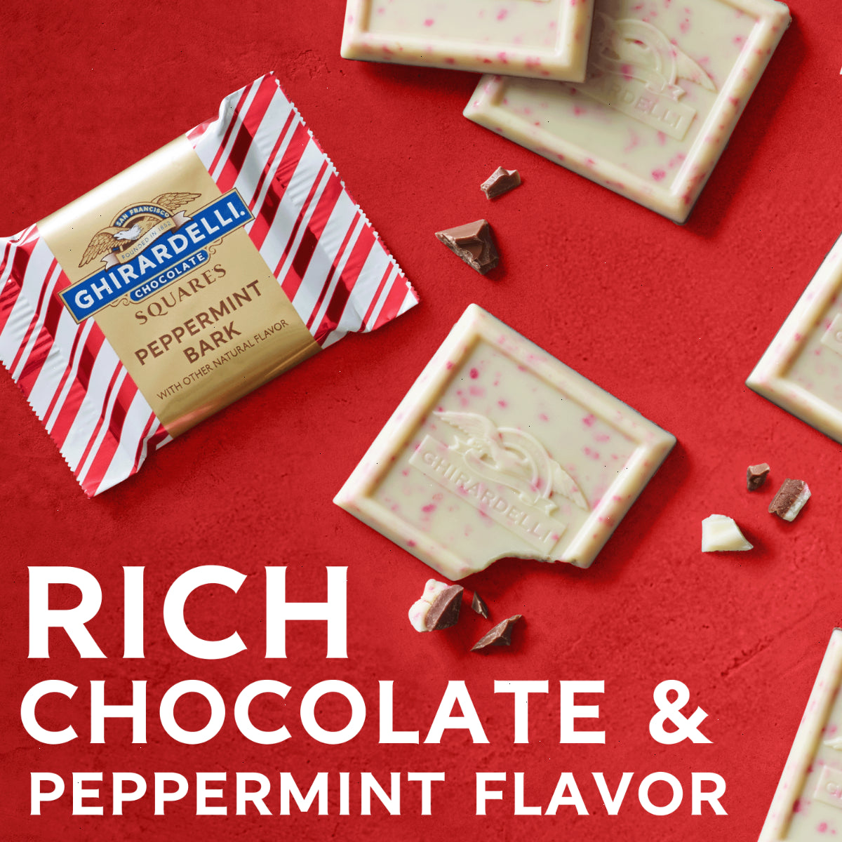 Create special memories and sweeten holiday traditions with Ghirardelli Peppermint Bark Chocolate Squares. This bag of Peppermint Bark squares features iconic packaging that is perfect for gifting, whether you need a thoughtful gesture for coworkers or delicious stocking stuffers for family and friends. Also ideal for entertaining, these individually wrapped chocolate squares are delectable post dinner holiday treats, and they add an elegant sparkle to candy dishes. With an irresistible flavor that signifies the start of the holiday season, Ghirardelli Squares feature decadent, rich chocolate layers and festive peppermint flavor. Each kosher chocolate square is made with premium ingredients and high quality cocoa beans for signature intense, slow-melting taste. Ghirardelli Peppermint Bark Squares come individually wrapped, making them the perfect size for an afternoon pick-me-up, whether you're at home, at work or on the go. Ghirardelli Makes the Holidays a Bite Better.