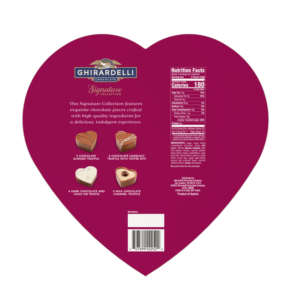 Celebrate Valentine's Day with an exquisitely crafted Ghirardelli Signature Sweetheart Premium Praline Chocolate Truffle Assortment Gift Box in a heart shaped gift box. Savor the complex symphony of our rich, slow-melting chocolate and sophisticated ingredients. The festive heart-shaped praline chocolate candy is the perfect way to celebrate the season of love.